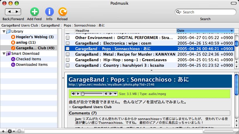 GarageBand Users Club代表のokattiさんから日本語対応のPodcasterを作りませんか?とメッセージをもらってから時間を見つけてちみちみと作業を進めてきたんだけれど、だいぶイメージが把握できるものが出来たので、まずはプレアルファ版をリリースしてみます。まだMP3のダウンロードも出来ません。iPodにも転送しません。RSSを登録してパースして中身をプレビューできる程度です。とりあえず方向性はこんな感じでってことで。